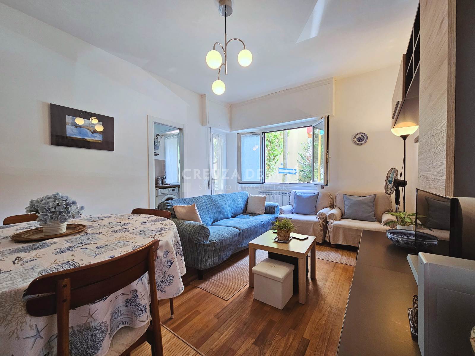 Internamente l'immobile è composto da: ingresso, soggiorno con accesso al balcone e al giardino, cucinotto indipendente, camera matrimoniale con accesso al giardino, due camere singole e bagno con finestra.