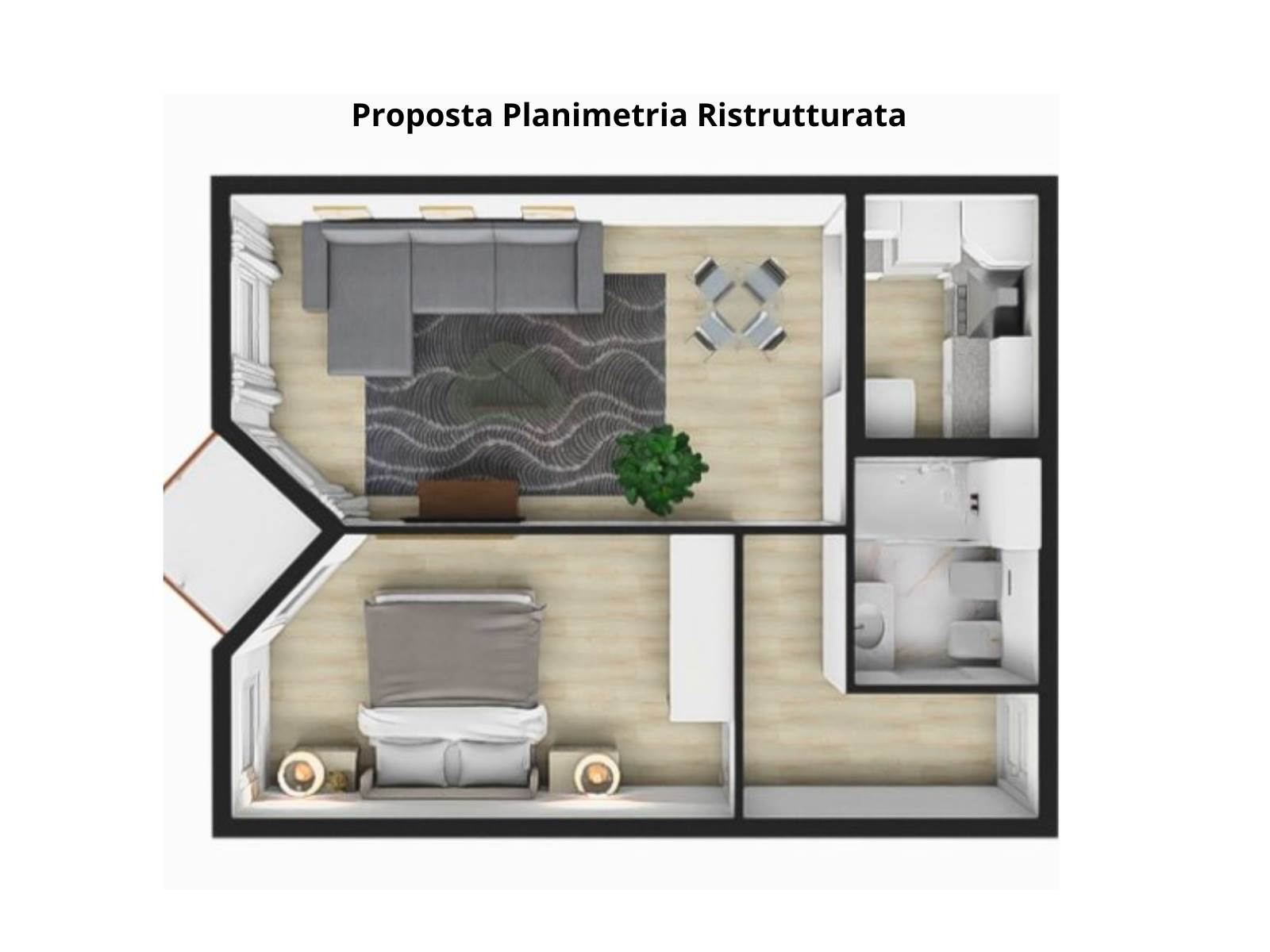 L'immobile è posizionato al primo piano con ascensore e internamente è composto da: ingresso, soggiorno con angolo cottura, camera e bagno.