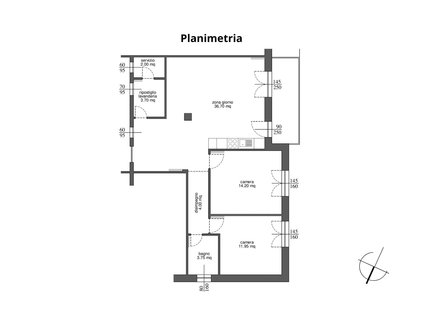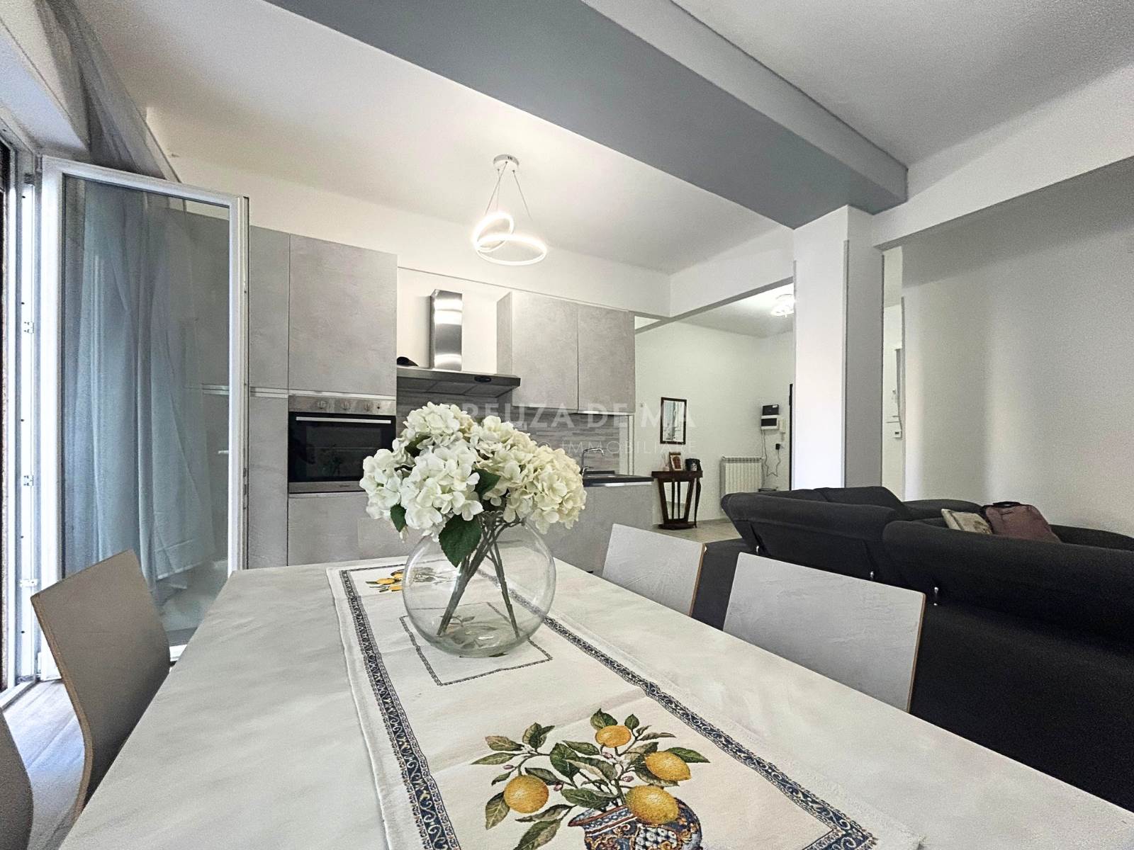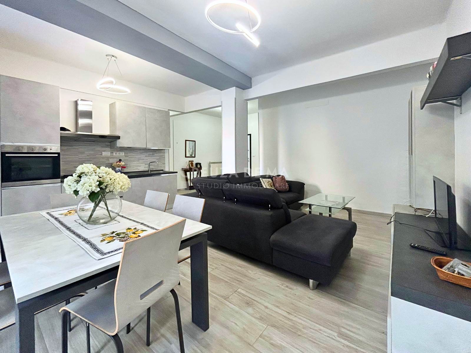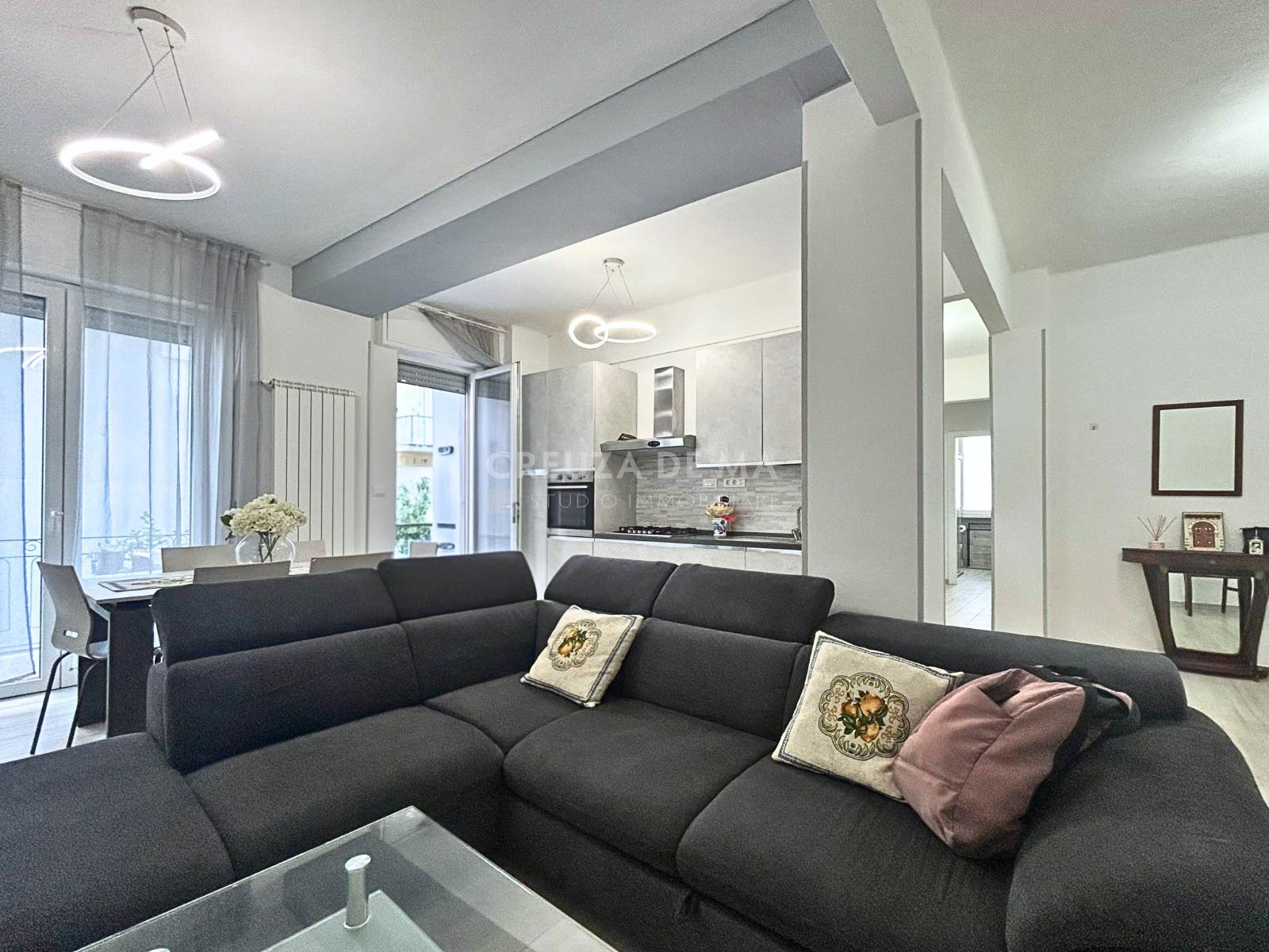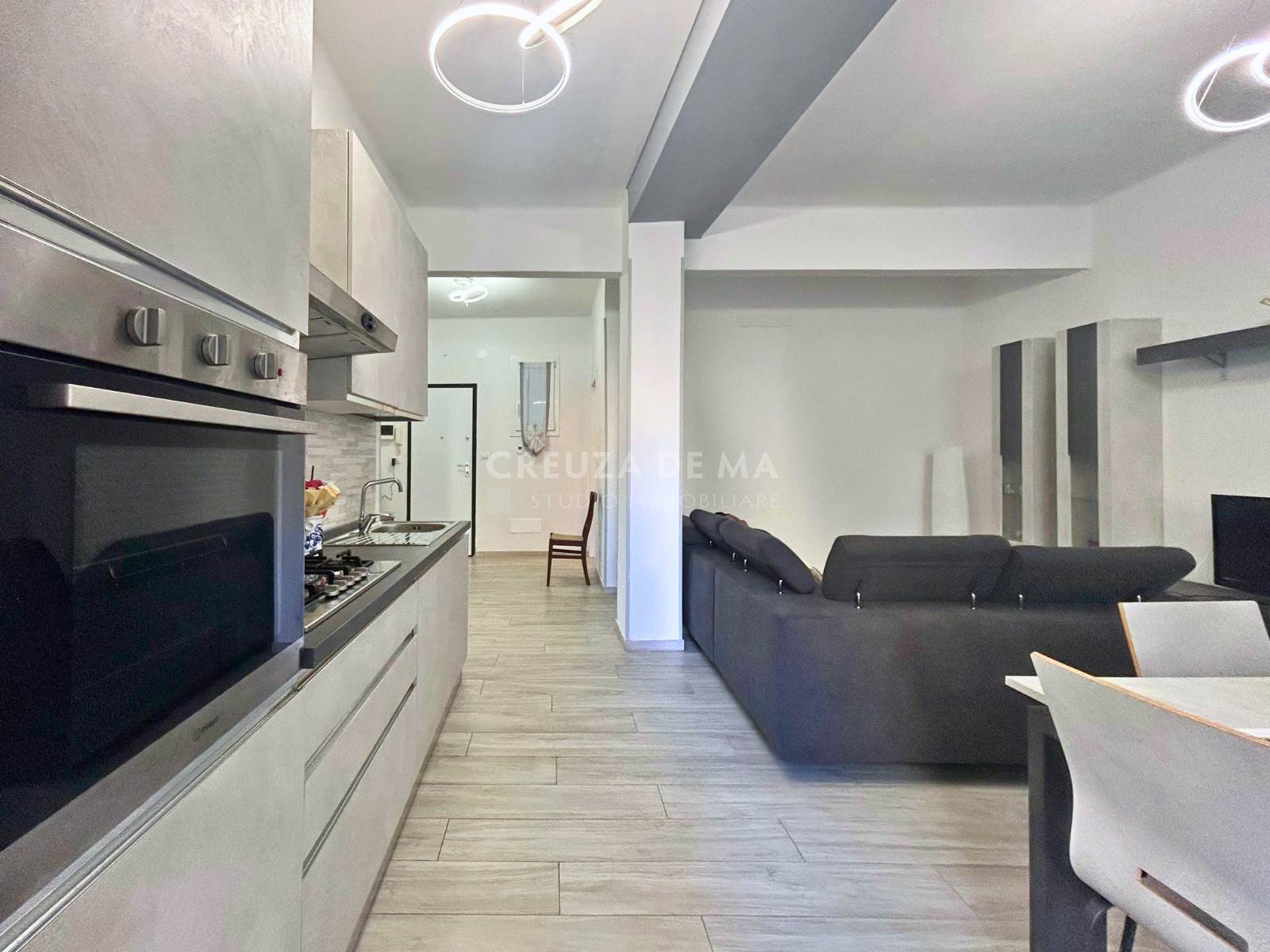 L'immobile è posizionato al primo piano di uno stabile in buone condizioni e internamente è composto da: ingresso, ampia zona living con cucina a vista, due camere matrimoniali e doppi servizi entrambi con finestra.