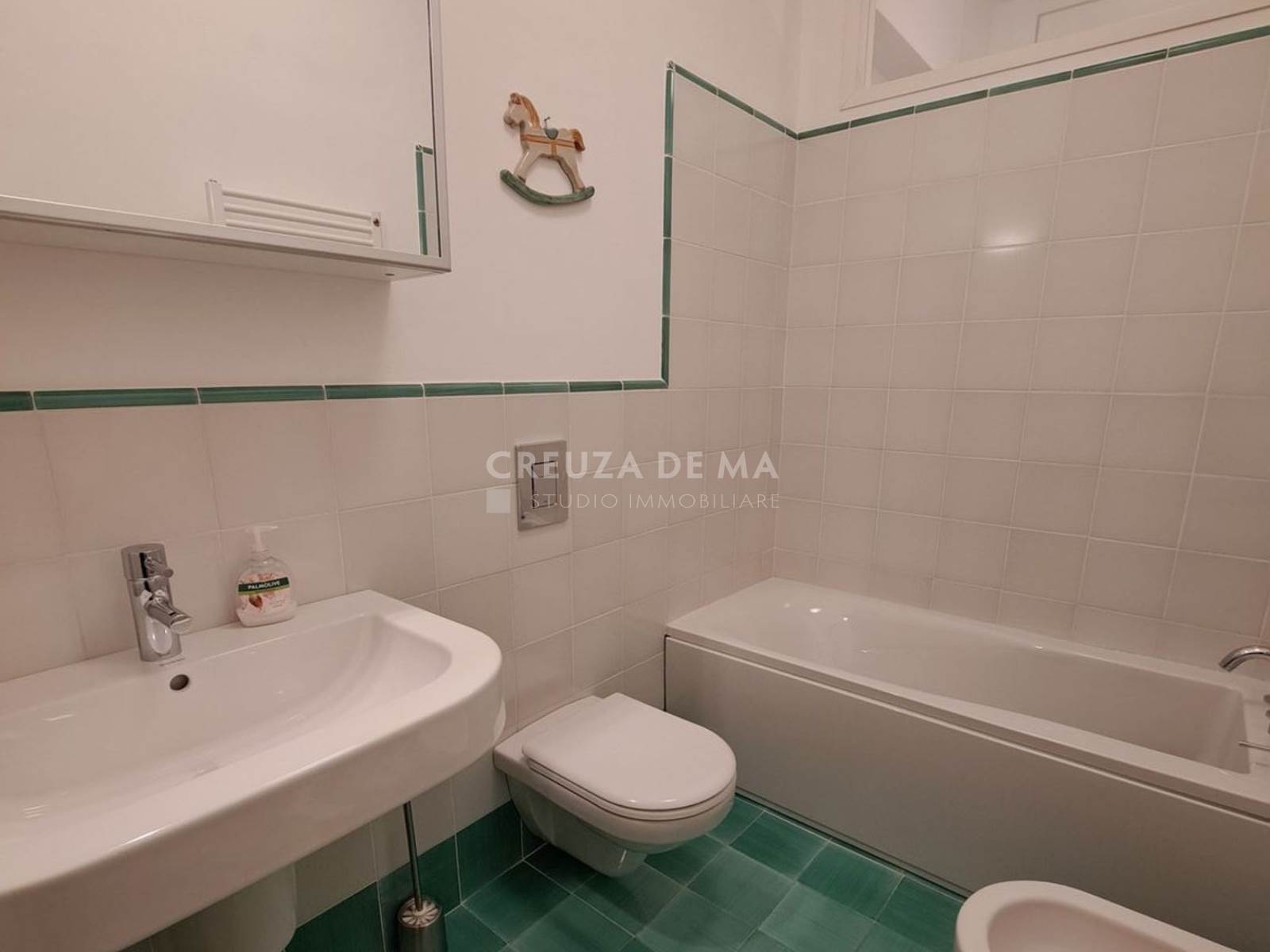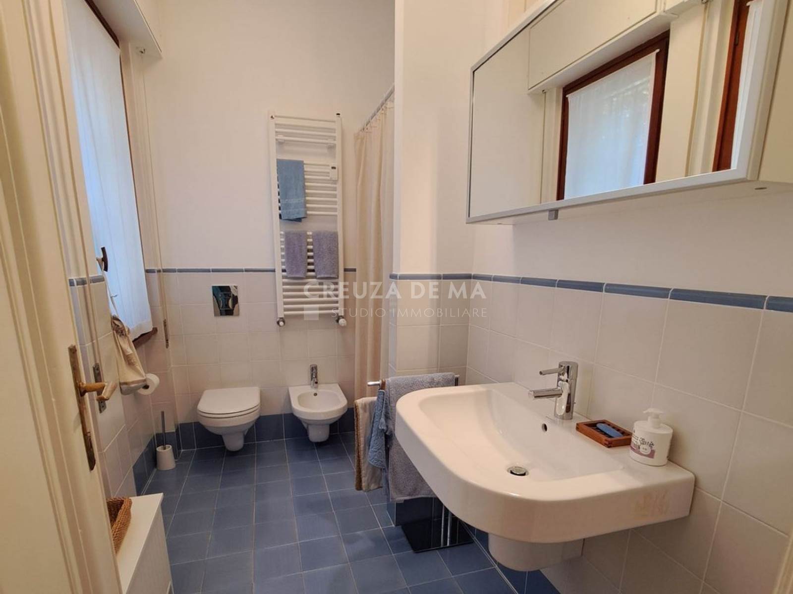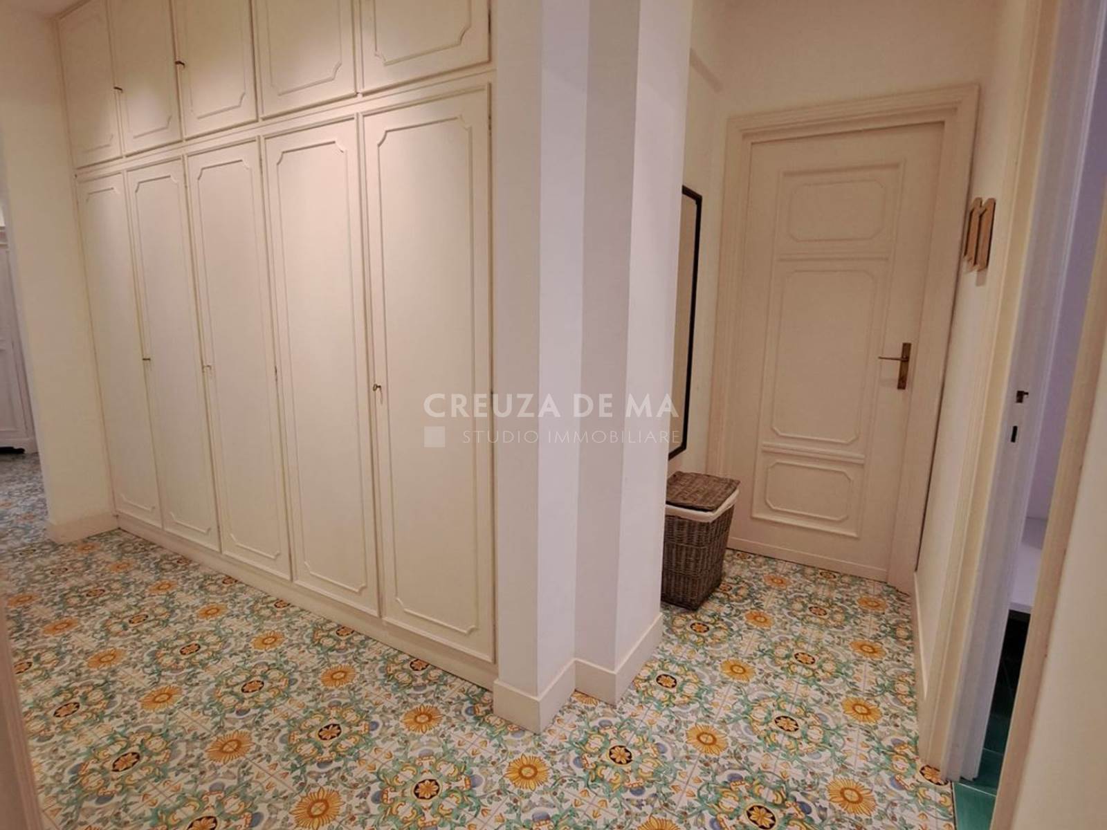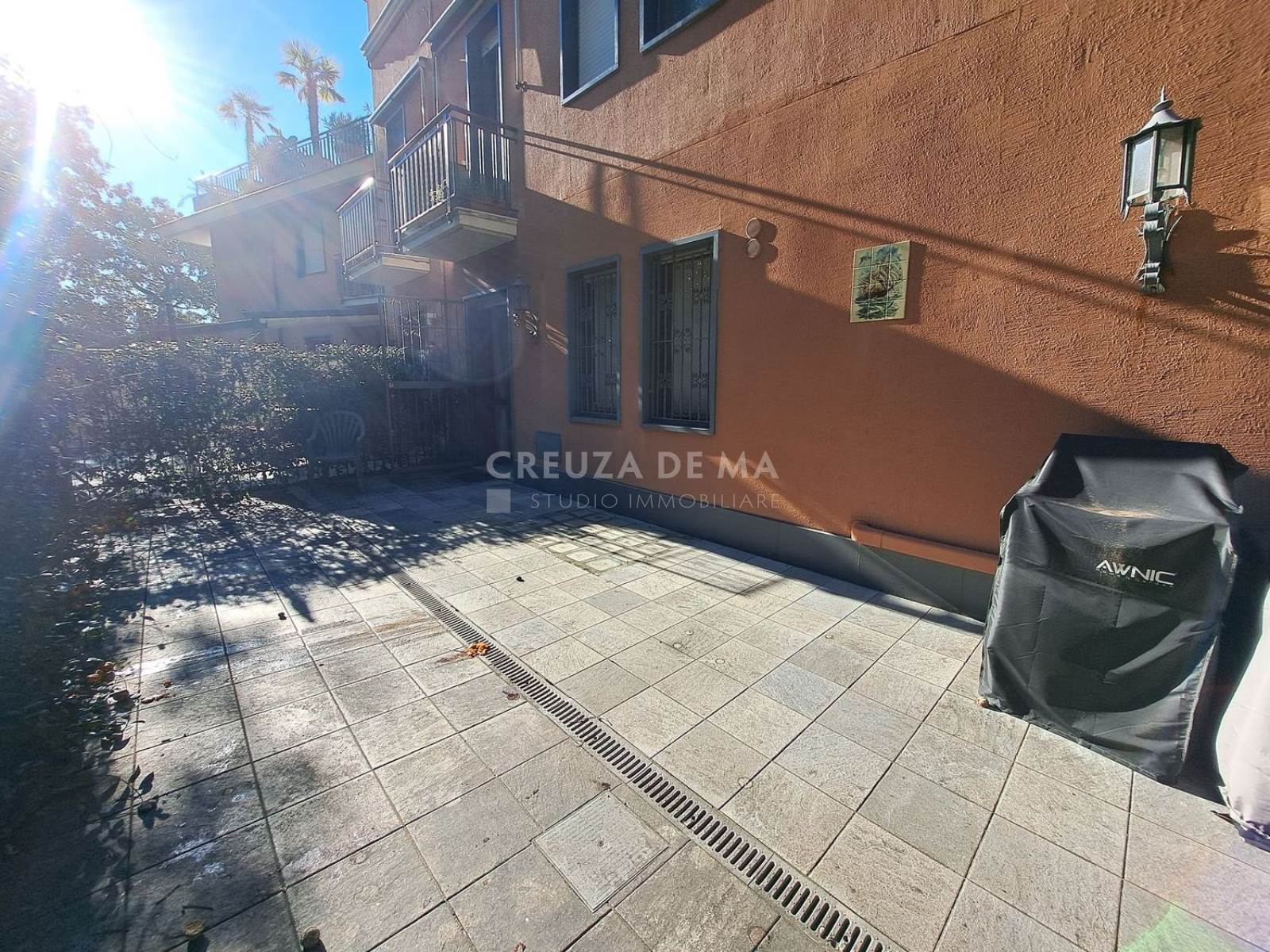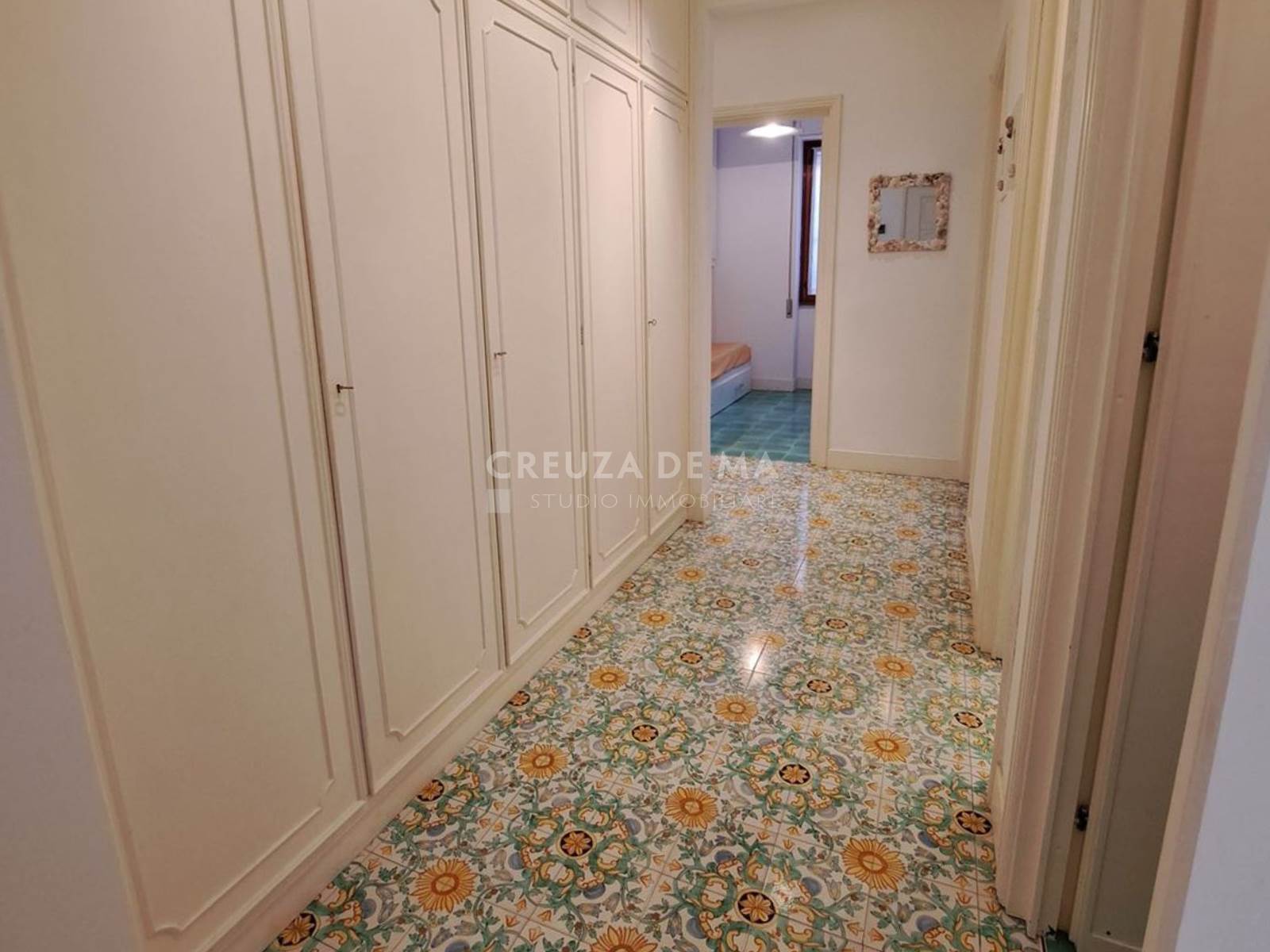 Totalmente e finemente ristrutturato, l'immobile si presenta come la soluzione definitiva per una clientela esigente alla ricerca di volumi generosi e finiture di pregio. L'ingresso introduce all'ampio salone doppio di rappresentanza, sapientemente suddiviso tra area living e zona pranzo. Da qui si accede al balcone che offre una piacevole vista panoramica sulla cittadina, con un affaccio che cattura la suggestiva parziale vista mare, un dettaglio che conferisce un innegabile valore emozionale all'ambiente. Il vero elemento di distinzione di questa proprietà è il suo magnifico spazio esterno terrazzato, una vera e propria oasi verde di generose dimensioni, preziosissima in un contesto centrale. Questo giardino privato si connette armoniosamente con la cucina abitabile, rendendosi l'ambientazione ideale per cene estive e momenti conviviali all'aperto. L'accesso a questo spazio di lusso è garantito anche dalla suite matrimoniale principale. La zona notte, funzionalmente separata, ospita due ampie camere matrimoniali, di cui una dotata di bagno privato esclusivo, e una versatile cameretta. Completano l'unità il secondo bagno padronale, un pratico vano lavanderia e armadiature a muro nel disimpegno. L'offerta è completata da una capiente cantina di 13 metri quadrati.