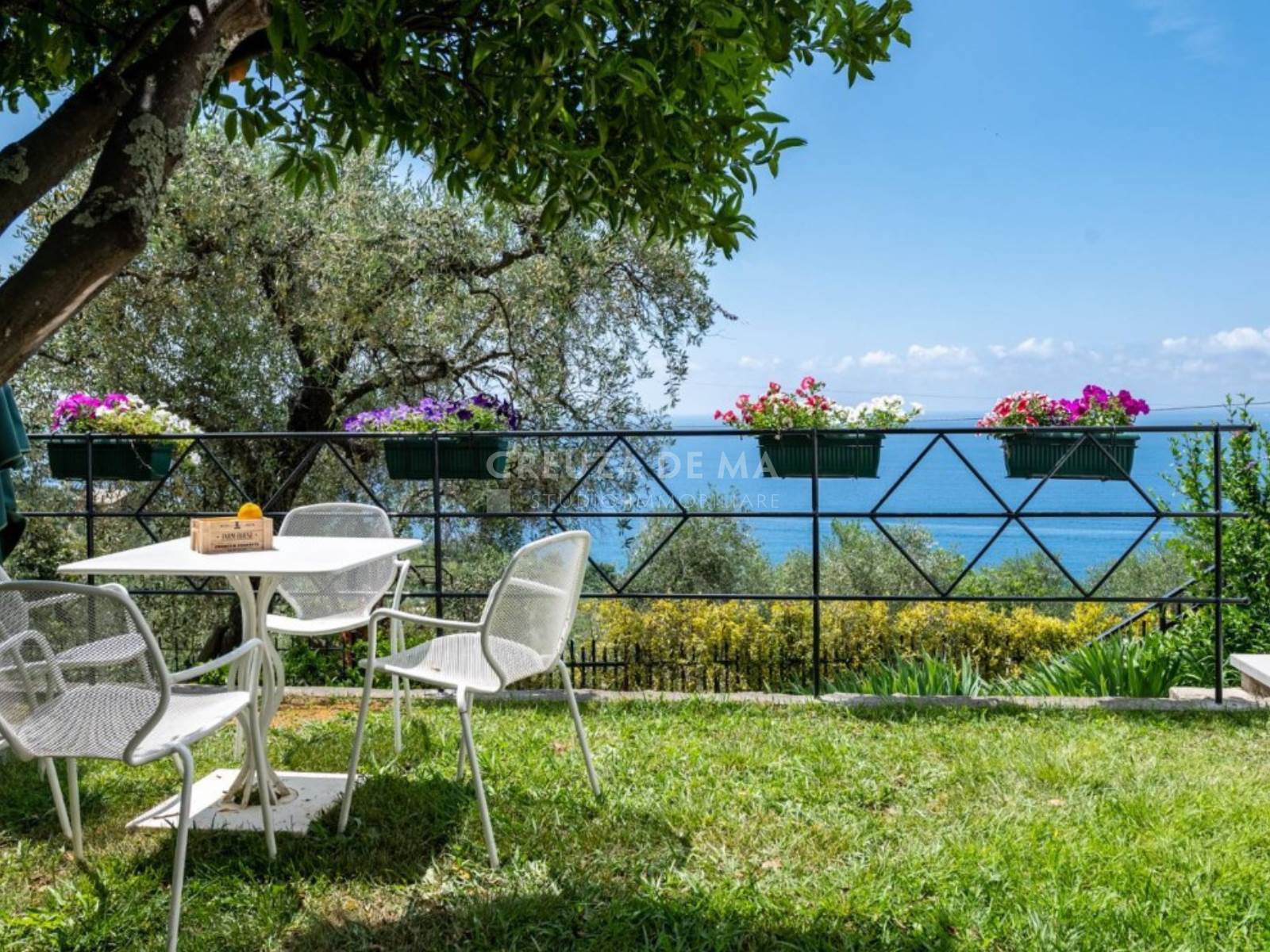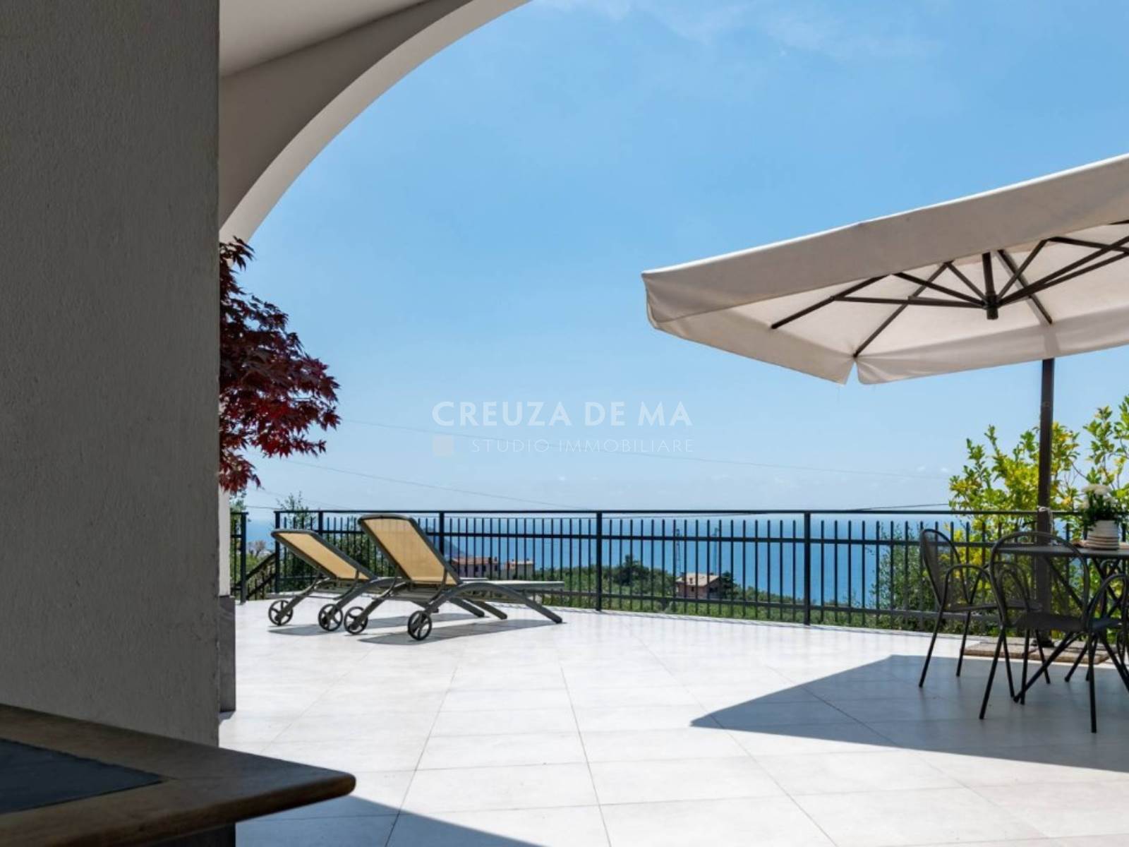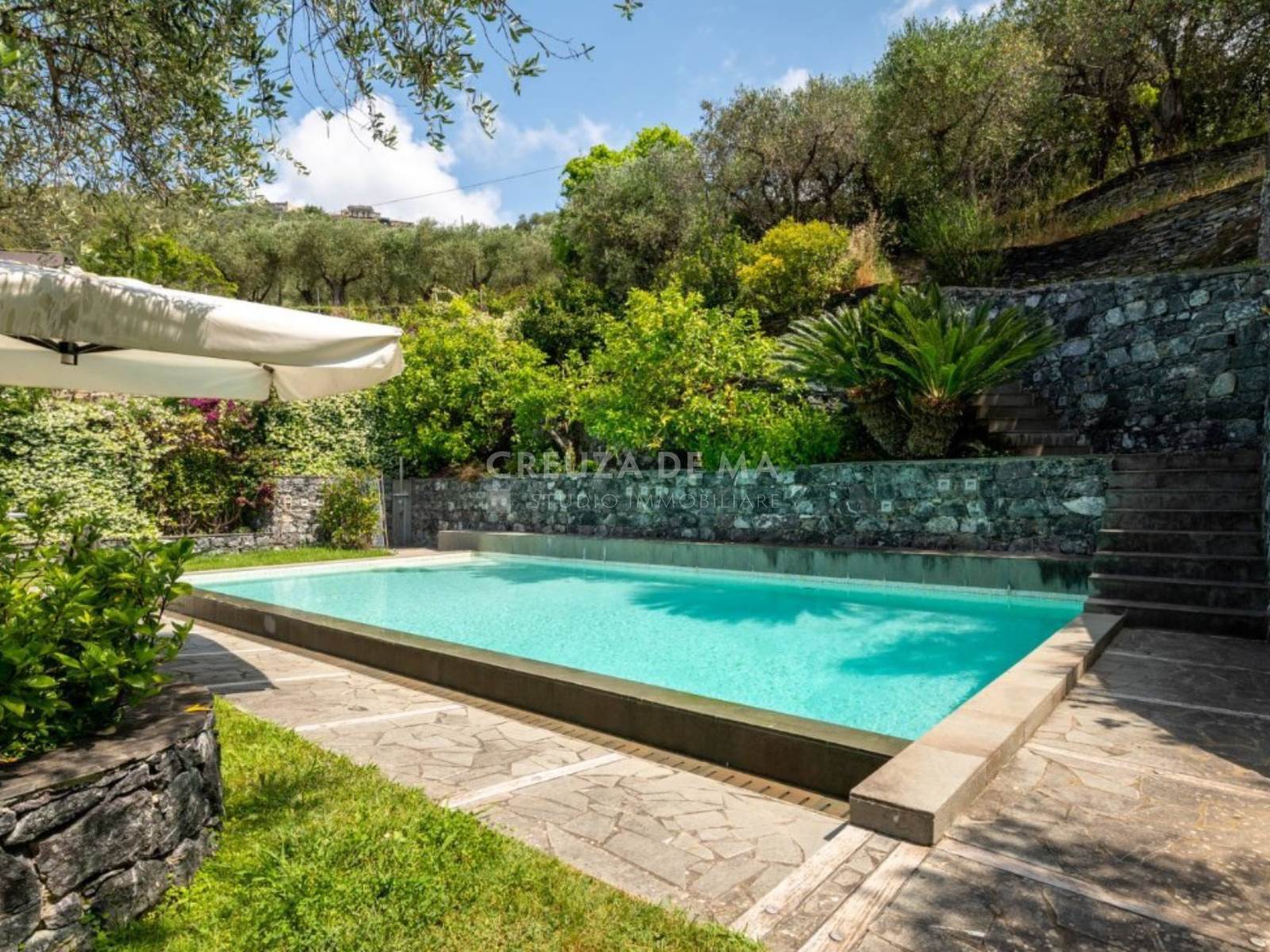 Il parco privato, curato nei minimi dettagli e in gran parte servito da irrigazione automatica, è arricchito da 140 ulivi, alberi da frutto e aree dedicate al relax, inclusi un forno a legna con barbecue, un patio e un ampio terrazzo panoramico ideale per la convivialità. Elemento distintivo della proprietà è la splendida piscina, incastonata tra ulivi e limoni, che vanta una vista mozzafiato sul mare.