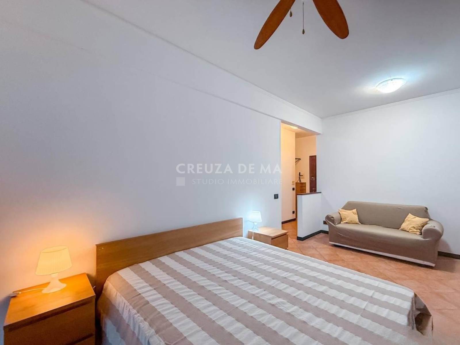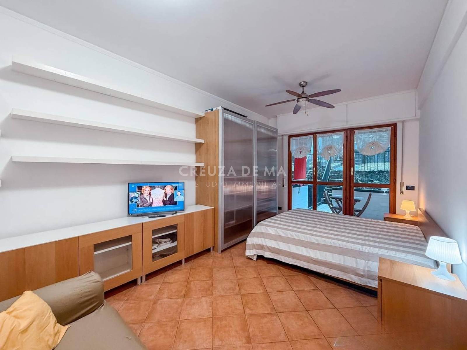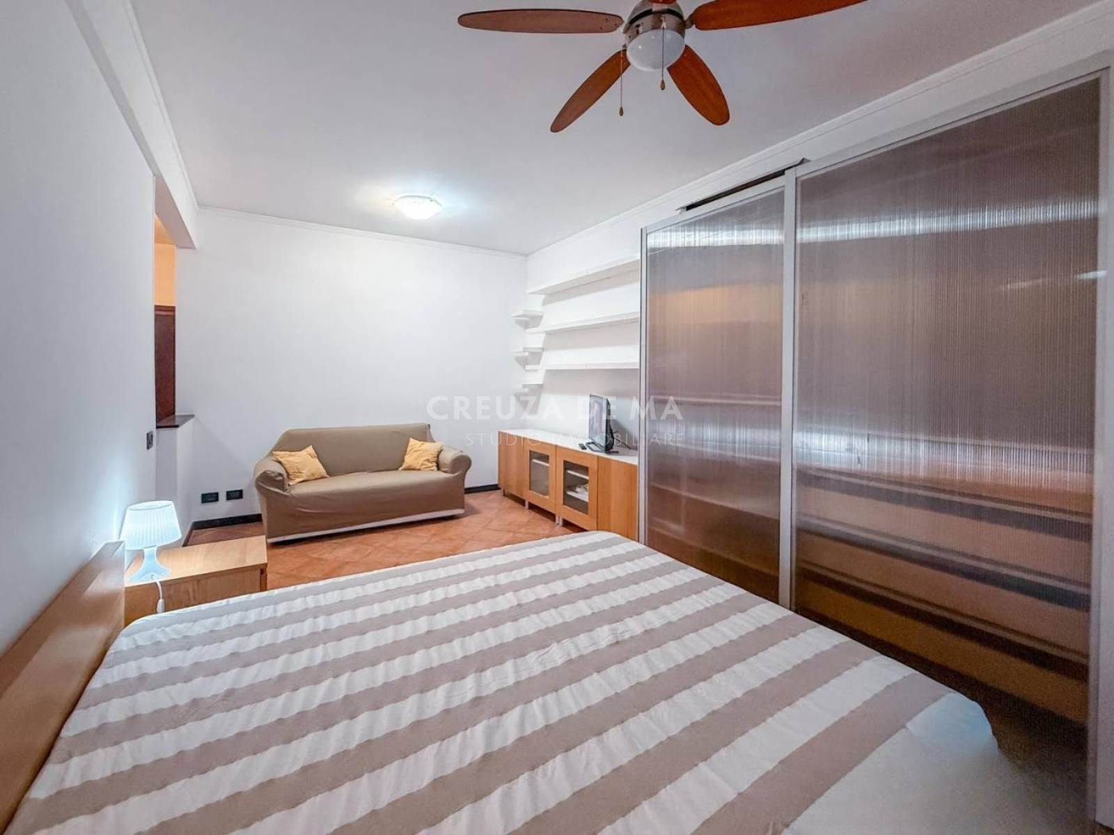 La zona notte/giorno è composta da un divano ed una struttura adibita a mobile TV/libreria dove poter condividere momenti di convivialità e un letto matrimoniale con ampia armadiatura. Entrambi gli ambienti sono dotati di due ampie portefinestre dalle quali si accede alla balconata coperta e al giardino posto su due livelli; il primo livello si presenta piastrellato con barbecue in muratura, perfetto per organizzare cene estive; il secondo livello, collegato da pochi gradini, si presenta con un praticello perfetto per porvi delle sedute dove godere di momenti di relax.